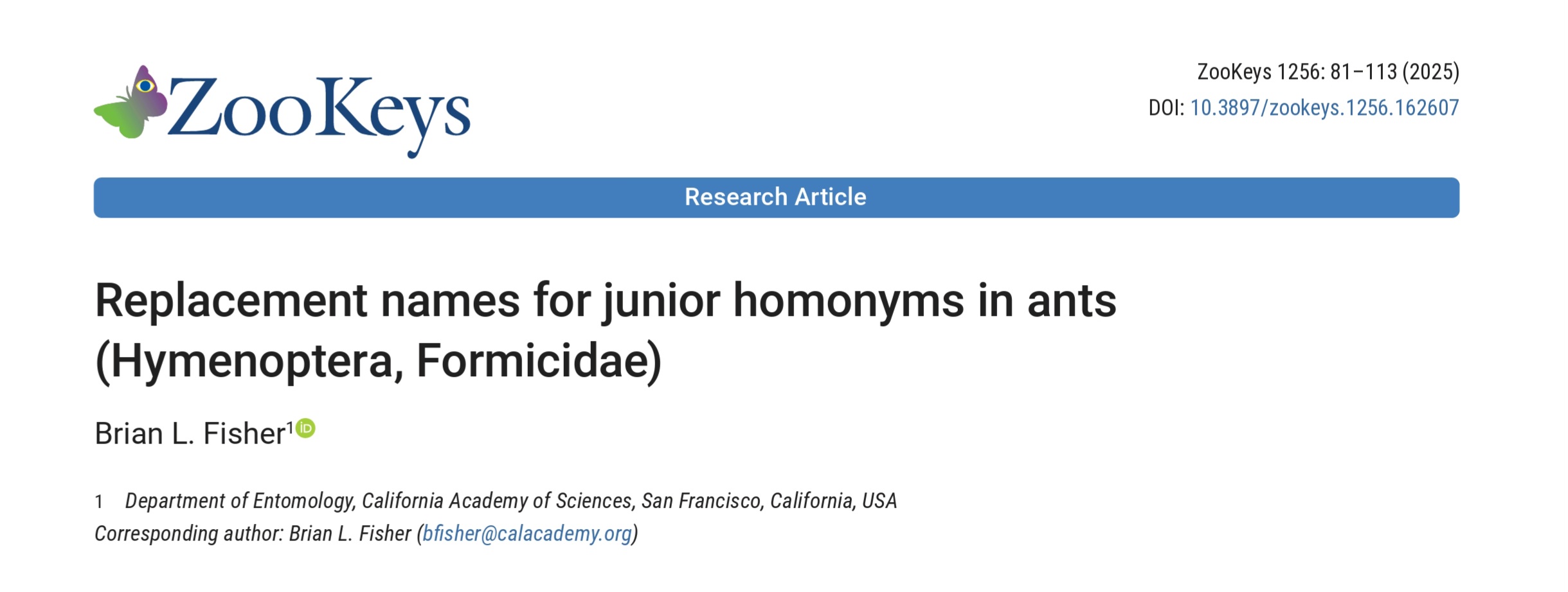 Oberski, J. T., Griebenow, Z. H., Adams, R. M. M., Andersen, A., Andrade-Silva, J., Barden, P., Borowiec, M., Brady, S., Casadei-Ferreira, A., Csősz, S., Dias, A. M., Dias, R. K. S., Feitosa, R. M., Fernandez, F., Fisher, B. L., General, D. E. M., Gomez, K., Hammel, J. U., Hawkes, P. G., Janda, M., Khalife, A., Ladino, N., Lieberman, Z. E., Lucky, A., Menchetti, M., do Prado, L. P., Prebus, M. M., Probst, R. S., Punnath, A., Richter, A., Salata, S., Sánchez-Restrepo, A. F., Schifani, E., Schultz, T. R., Silva, R. R., Sosa-Calvo, J., Tocora, M. C., Ulysséa, M. A., van de Kamp, T., Wang, W. Y., Williams, J. L., Camacho, G. P., Boudinot, B. B., 2025, “Ant systematics: past, present, and future.” Insect Systematics and Diversity, vol. 9, no. 4, art. Ixaf025, pp. 1-42 (+ 5 supporting files.).