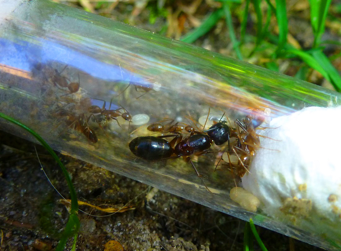 ich habe nun eine hübsche, schlanke Camponotus aus Malaysia abzugeben, nachdem die Königin bei mir gegründet hat. Es handelt sich um eine mittelgroße, gelbbraun gefärbte Art, deren Majore schwarze Köpfe haben. Sie kommen natürlicherweise im tropischen Regenwald vor und belaufen gerne auch Büsche und Bäume; dementsprechend sind sie recht flott unterwegs und ich konnte ab und zu beobachten, dass kleine Distanzen per Sprung überbrückt wurden. Ein bepflanztes Becken wäre für diese Art optimal, aber natürlich nicht zwingend notwendig.
