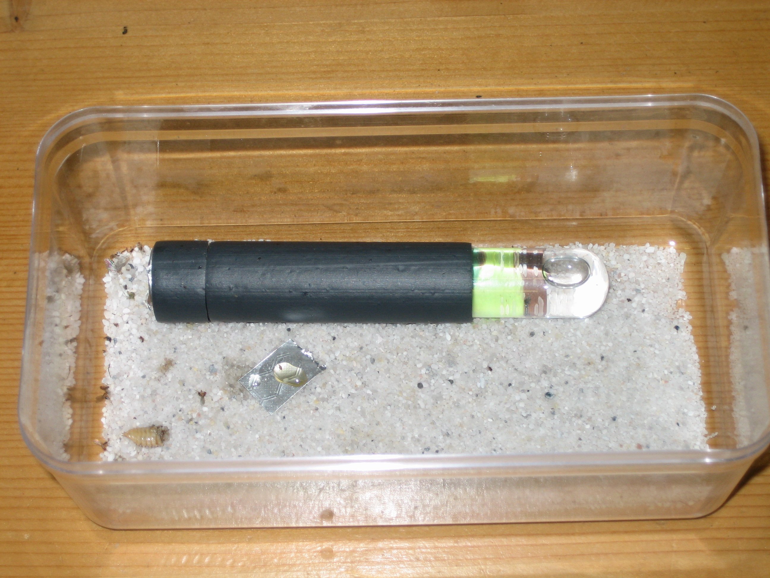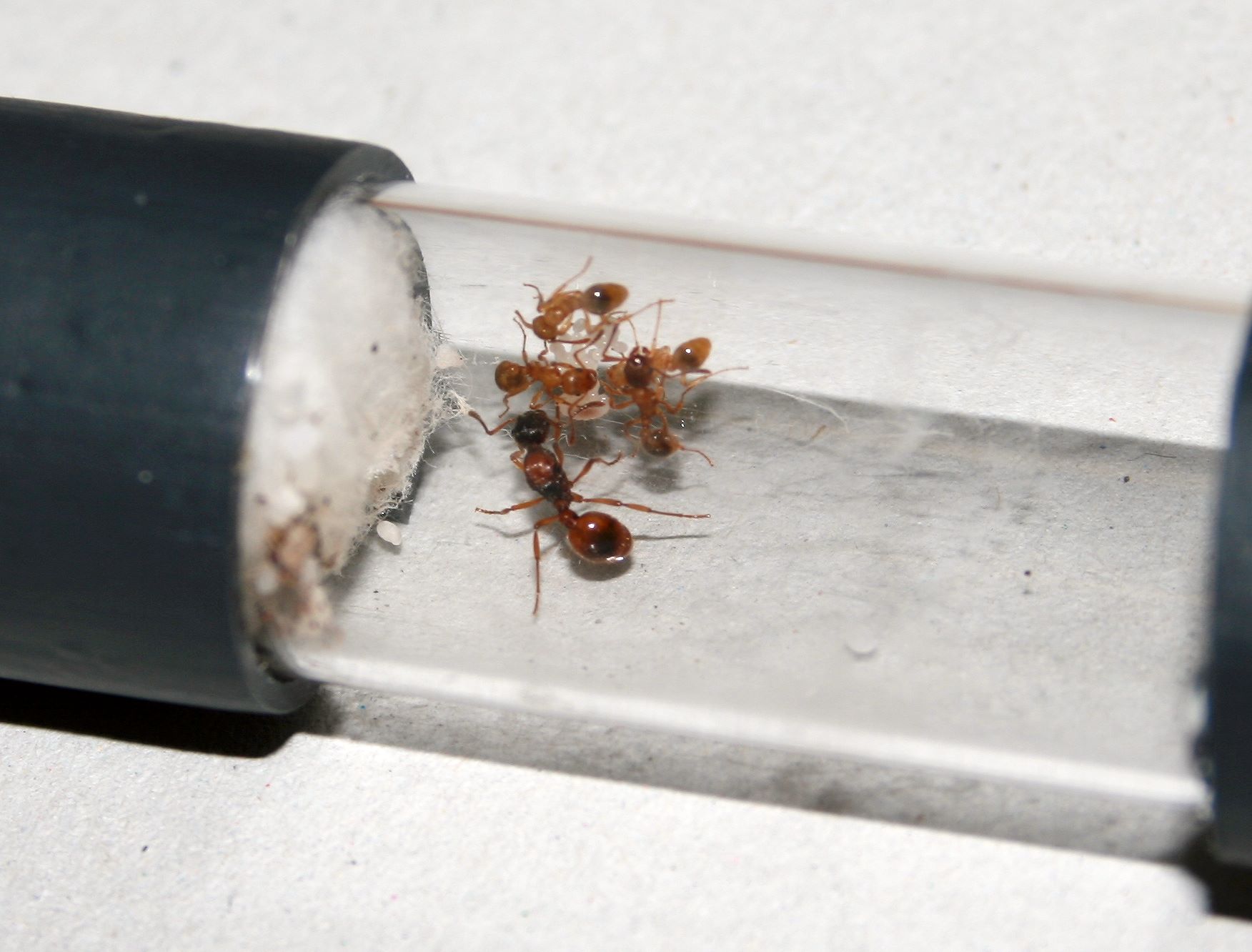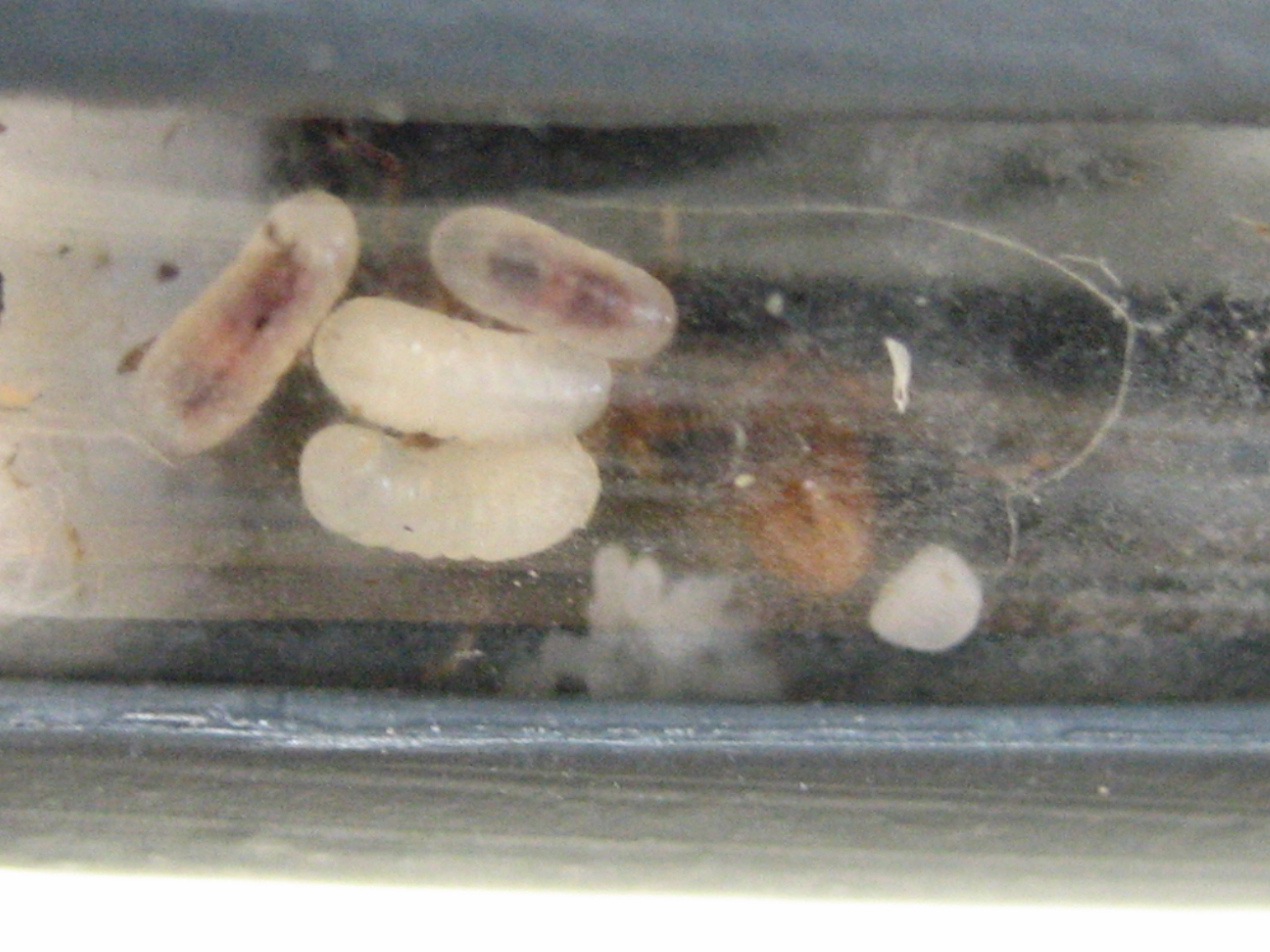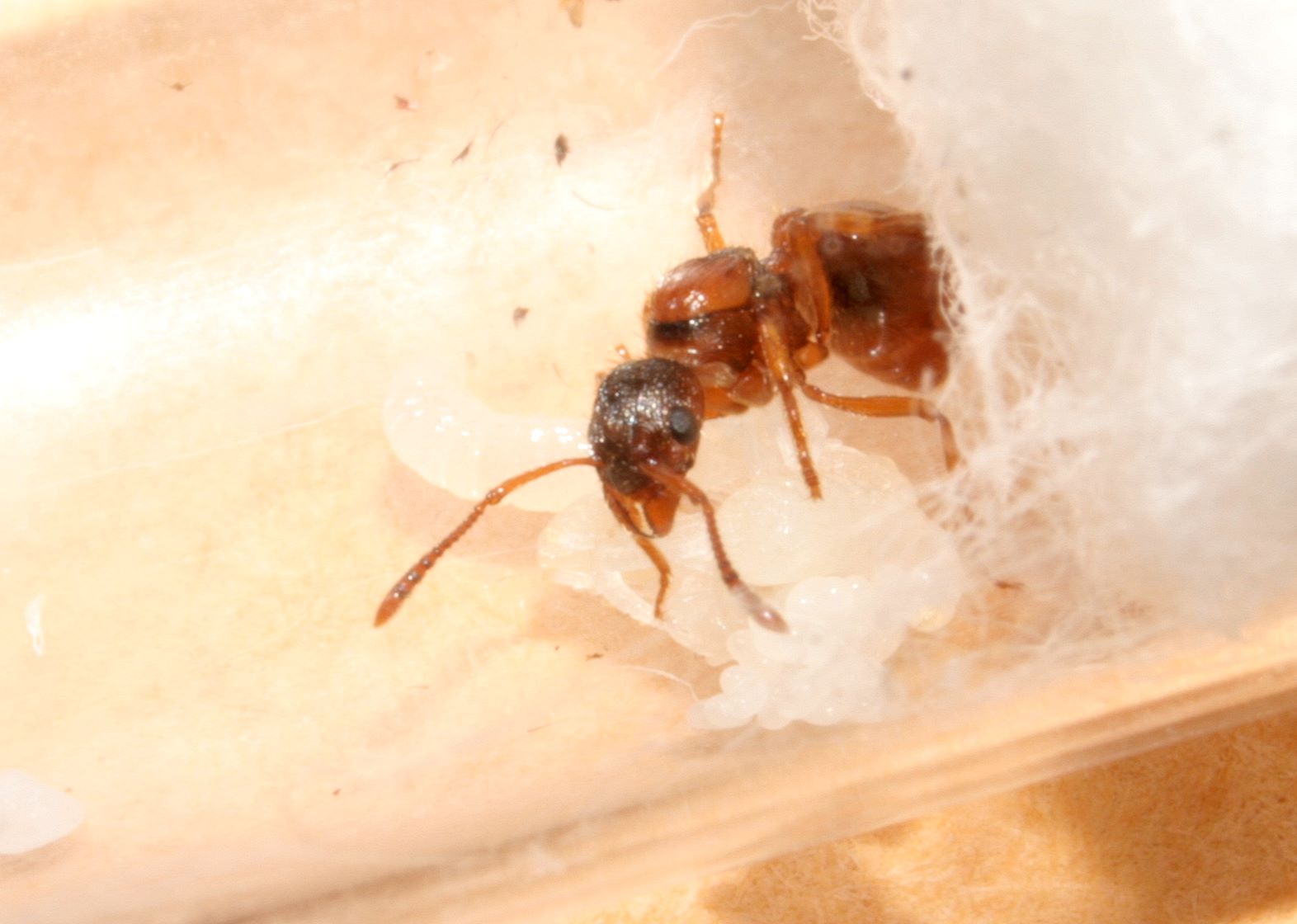 Ich habe versucht, sie möglichst wenig zu stören, aber inzwischen ist bereits eine Puppe, eine größere Larve und einige Eier vorhanden. Die Gyne wirkt sehr vital.