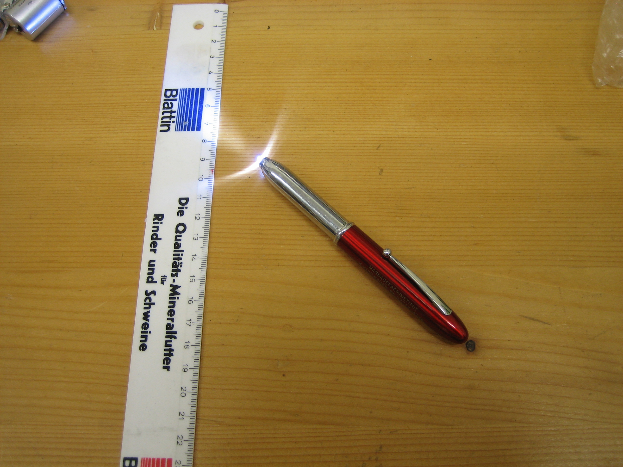 Ich hab hier noch ein paar ganz nützliche teile, wie zB diesen Stift mit der kleinen Lampe an der Spitze, mit der ich auch mal in die Gänge rein leuchten kann