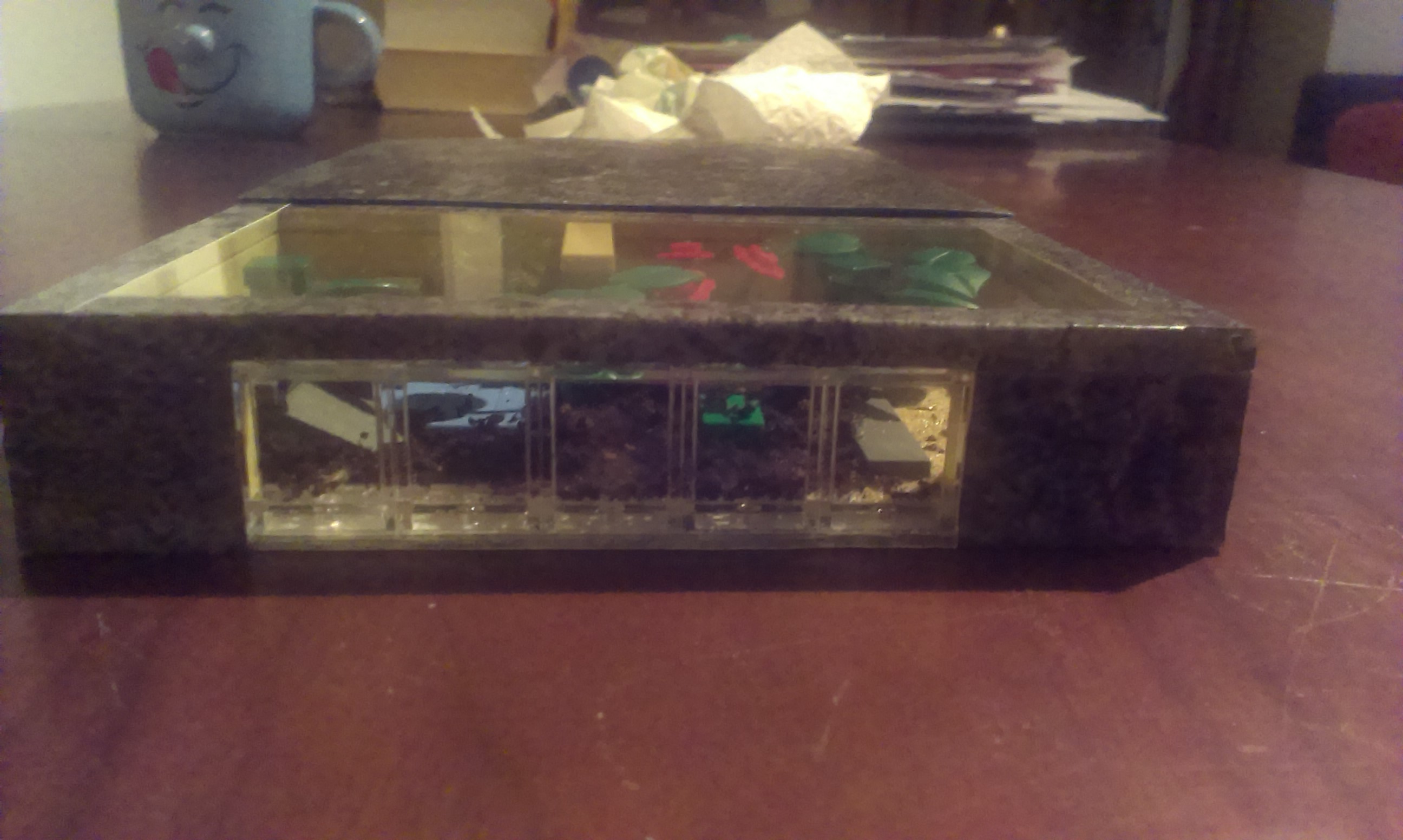 Die Steine um die beiden Teile zusammenzufügen schließen nicht zu 100 % . Dort entsteht eine winzige Lücke zwischen Nest und Arena . Teilweise auch weil ich ungenau mit den Plexiglassplatten gearbeitet habe :/ .