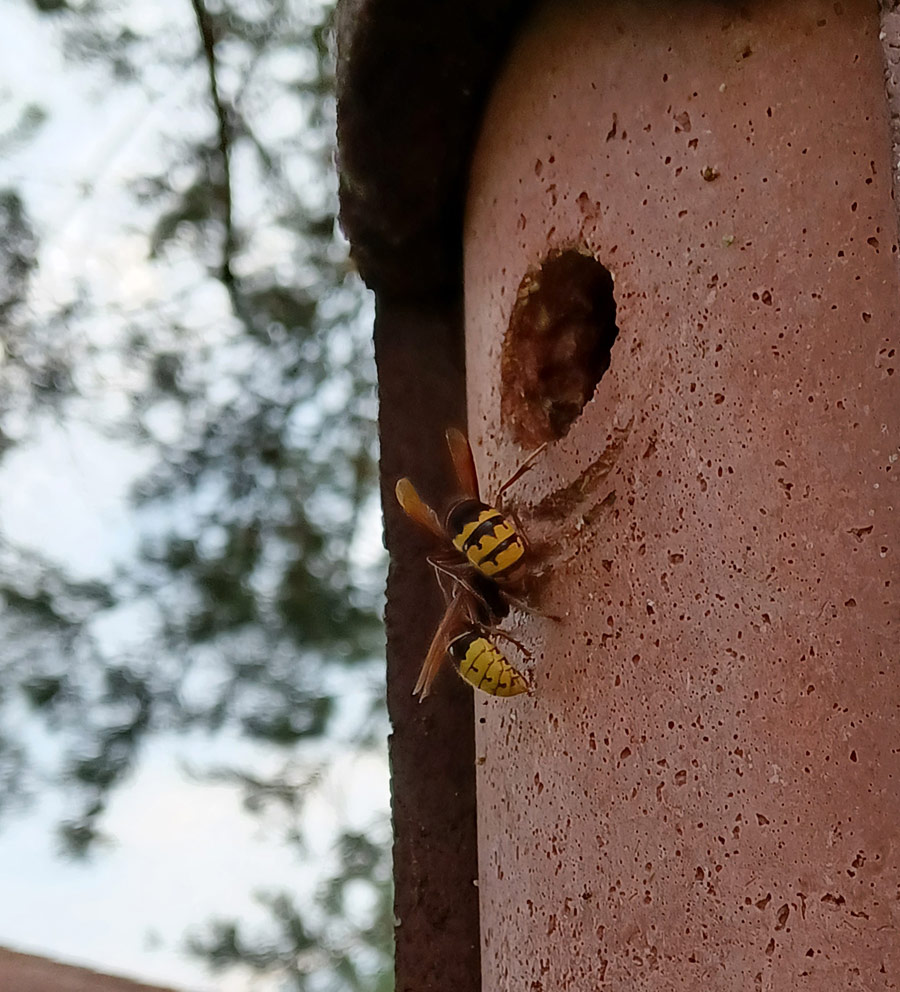 Jedenfalls habe ich seit dem Frühjahr (leider keine genauen Daten gespeichert) eine Hornissenkönigin beobachtet, wie sie direkt neben unserer Terrasse einen Nistkasten für Blaumeisen mehrfach inspiziert hat.