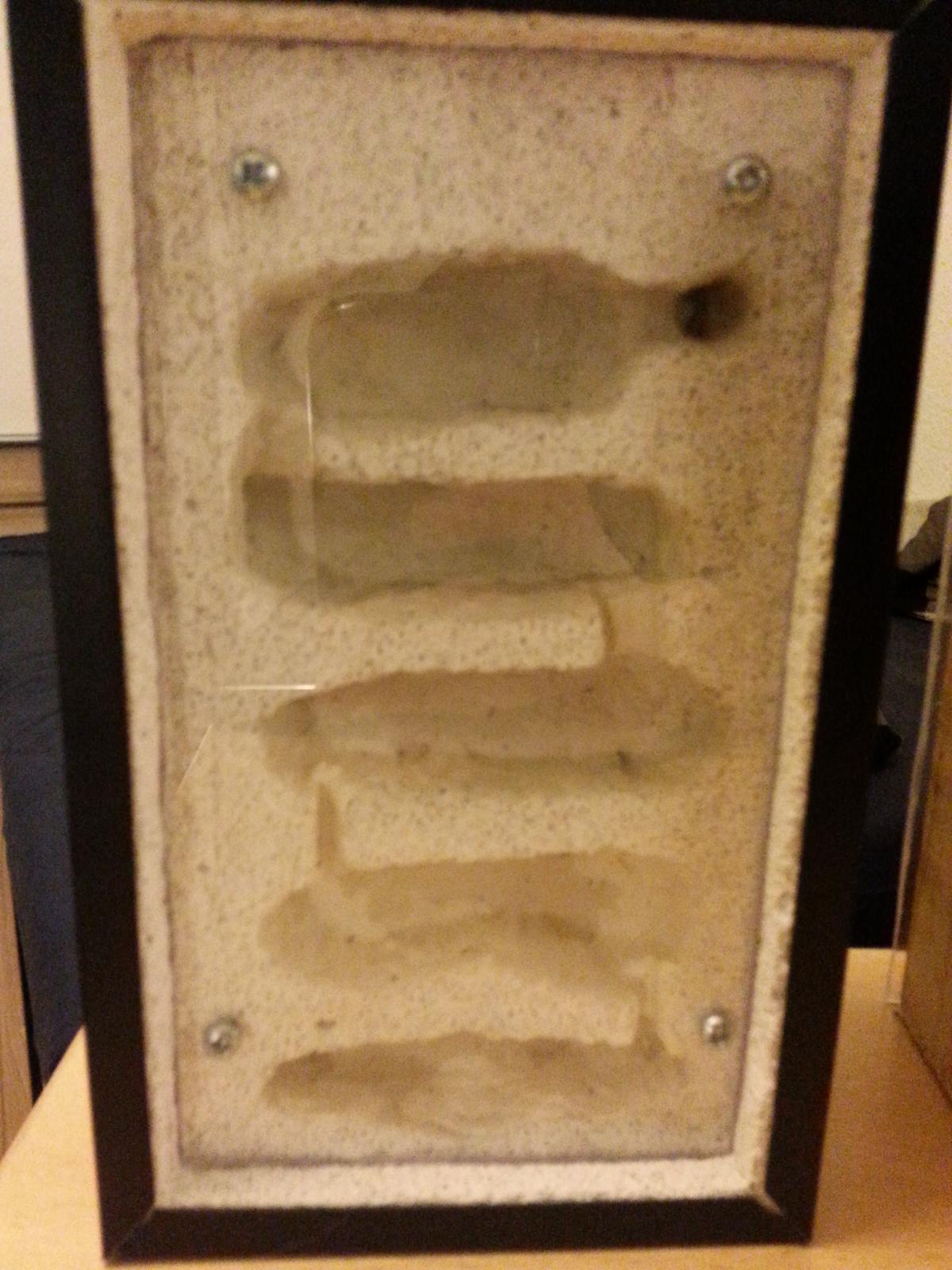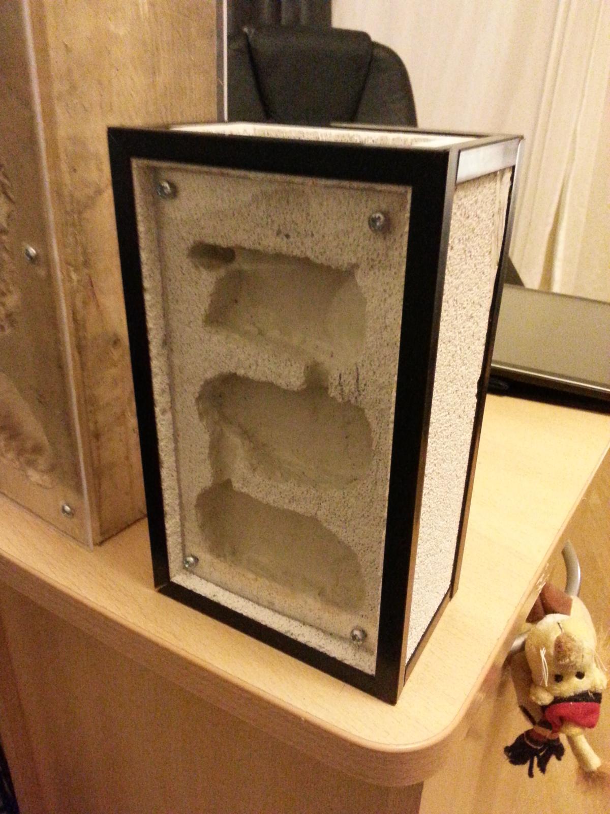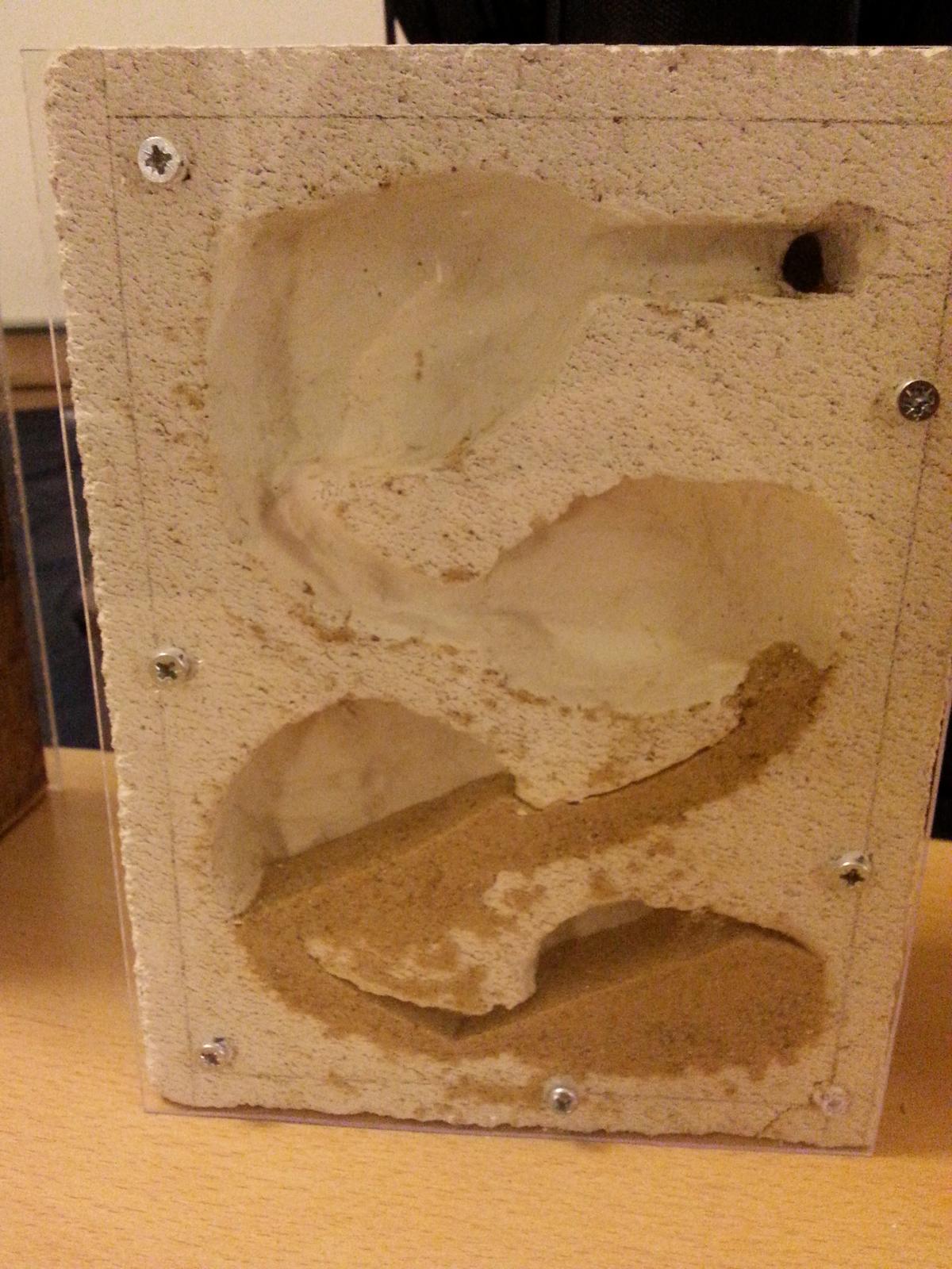 Das nächste ist mein zweiter Versuch mit Ytong. Meiner Meinung nach um Welten besser als der Erste. Ich habe die Plexiglasscheiben 1 cm eingelassen und es beidseitig bearbeitet. Dabei habe ich unterschiedliche Kammergrößen gebaut. Zum Schluss habe ich alles mit Plastikwinkeln abgedeckt. Im Gegensatz zum ersten Versuch habe ich hier keine Dübel (die eh vollkommen ungeeignet waren) benutzt, sondern direkt in den Ytong geschraubt (klein vorbohren). Das ist keine absolute Lösung, da die Löcher nicht ewig halten werden, wenn man die Platten ab und zu mal abnehmen möchte.