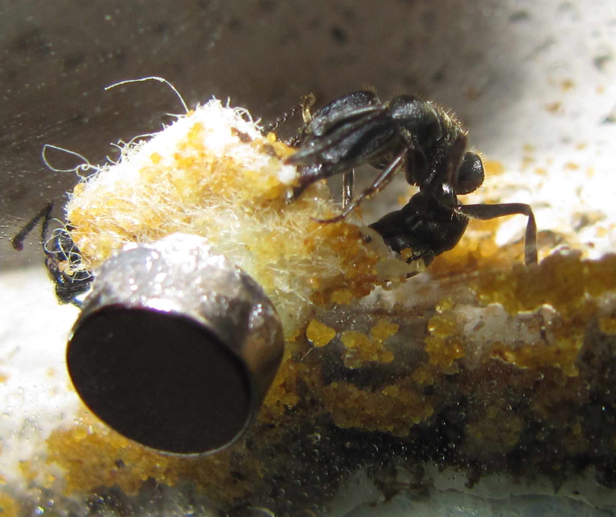 Vorsicht: Manche Magneten sind unglaublich stark. Man muss darauf achten, dass die Scheibe nicht springt, wenn man die Magneten zusammen prallen lässt, also möglichst kurze Distanzen zum anziehen benützen. Ausserdem muss man darauf achten, dass keine Ameisen in der Nähe sind und zerquetscht werden können. Die Ameisen mögen diese Reinigungsarbeiten selbstredend nicht und greifen den vermeindlichen Eindringling sofort an.