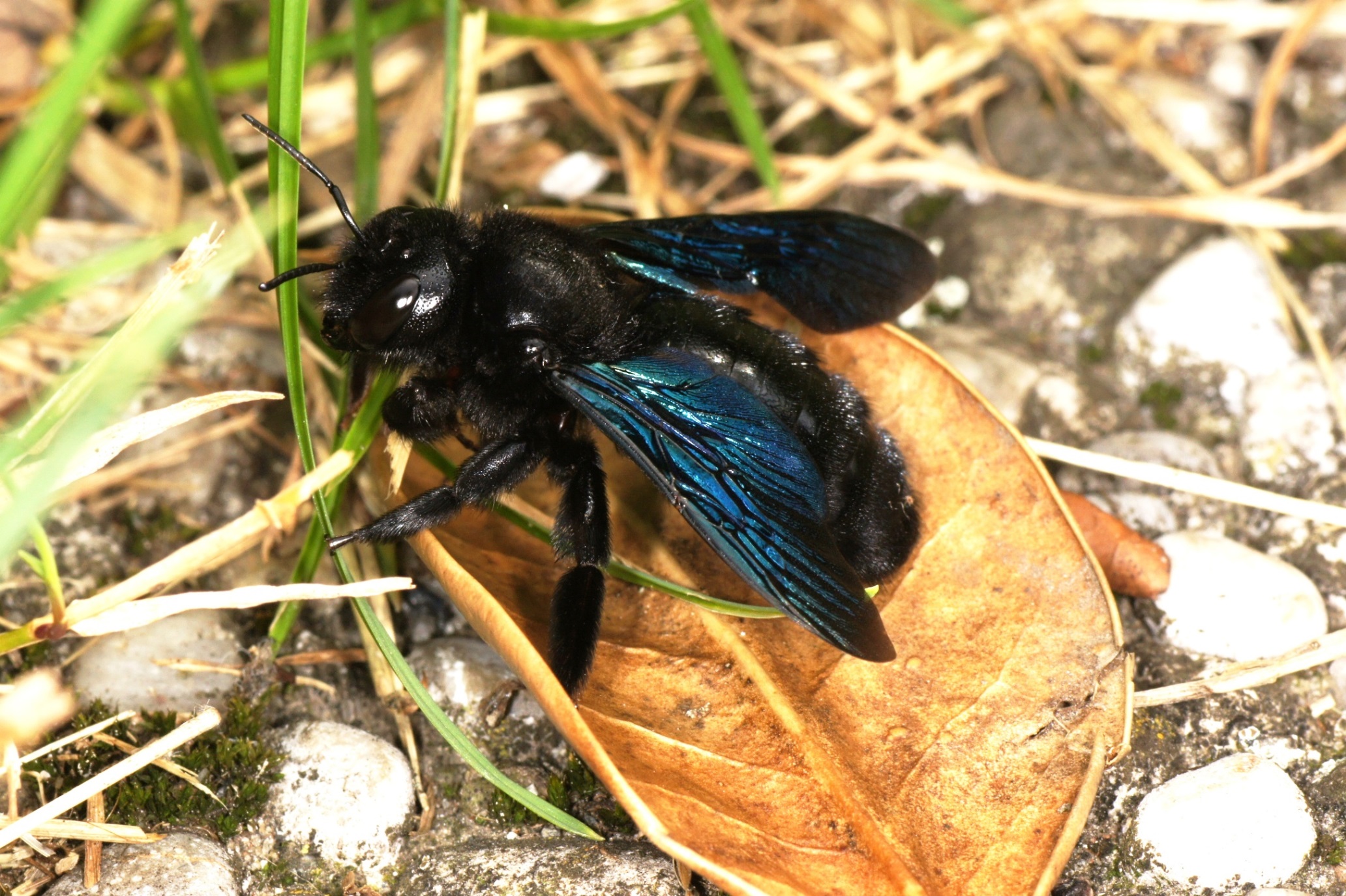 Über die imposanten Holzbienen hatte ich schon im alten AF 2011 berichtet, dort sind aber leider die Bilder verschwunden. Ich fand damals eine Holzbiene am Boden sitzend und ich dachte es gehe mit ihr zu Ende. Da diese Insekten hervorragende Flieger sind und auf die Annäherung des Menschen sofort mit Flucht reagieren, holte ich rasch meine Kamera. Es dürfte sich um Xylocopa violacea handeln, zu verwechseln wäre sie mit Xylocopa valga. Eine dritte Art kommt (bisher) in Mitteleuropa vor: Xylocopa iris, die angeblich von den beiden zuerst genannten Arten leichter zu unterscheiden ist. Die Insekten werden bis etwa 2 cm lang, hier handelt es sich um ein Weibchen.