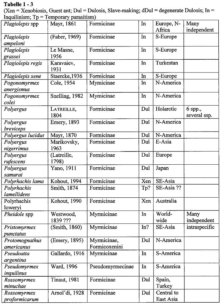 Aus: Buschinger, A. (2009): Social parasitism among ants: a review. (Hymenoptera: Formicidae).- Myrmecol. News 12: 219-235. http://www.myrmecologicalnews.org/cms/i ... ntable.pdf