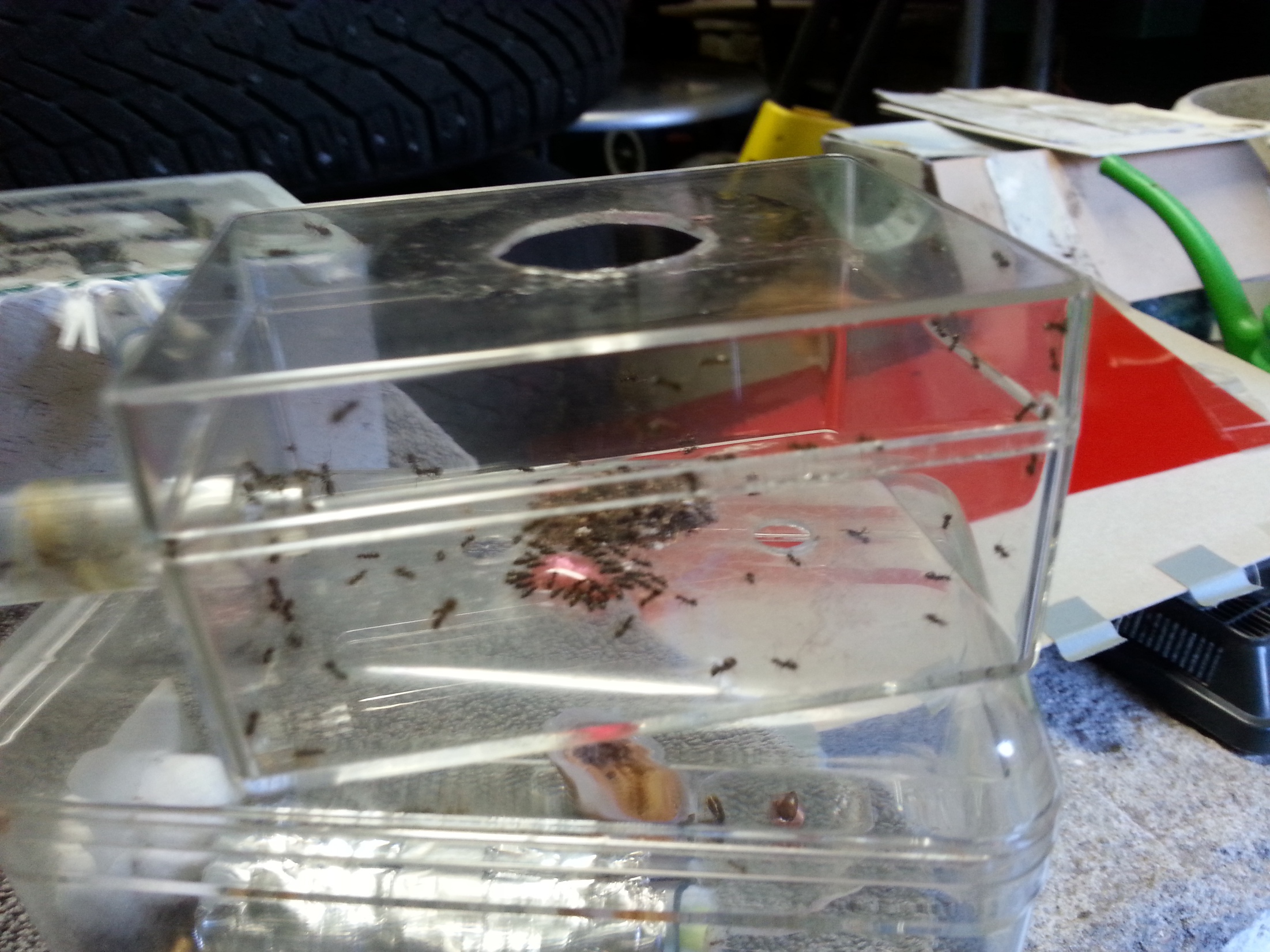 Als sie ankamen waren es rund 9 Arbeiterinnen und ein paar Larven, mehr nicht. Sie bekamen eine Farm und eine 30x20 cm große Arena und ebenfalls eine 30x1x20 cm große Farm zum graben. Sie wurden in die Arena gelegt und mit ein bisschen Honig und einem Heimchen gefüttert. Schnell zogen sie in die Farm und waren die nächsten Wochen kaum zu sehen.
