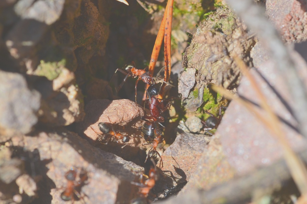 Das Kapitel des außergewöhnlichen Neststandorts von Formica s. str. will ich abschließen. Vor ein paar Tagen habe ich das Gebiet nochmal besucht. Von den Ameisen keine Spur- das alte Nest und auch der neuere Standort sind verlassen. Ich habe den weiteren Umkreis abgesucht und keine Arbeiterinnen mehr gefunden. An beiden Nestern habe ich keine tote Ameisen gefunden.